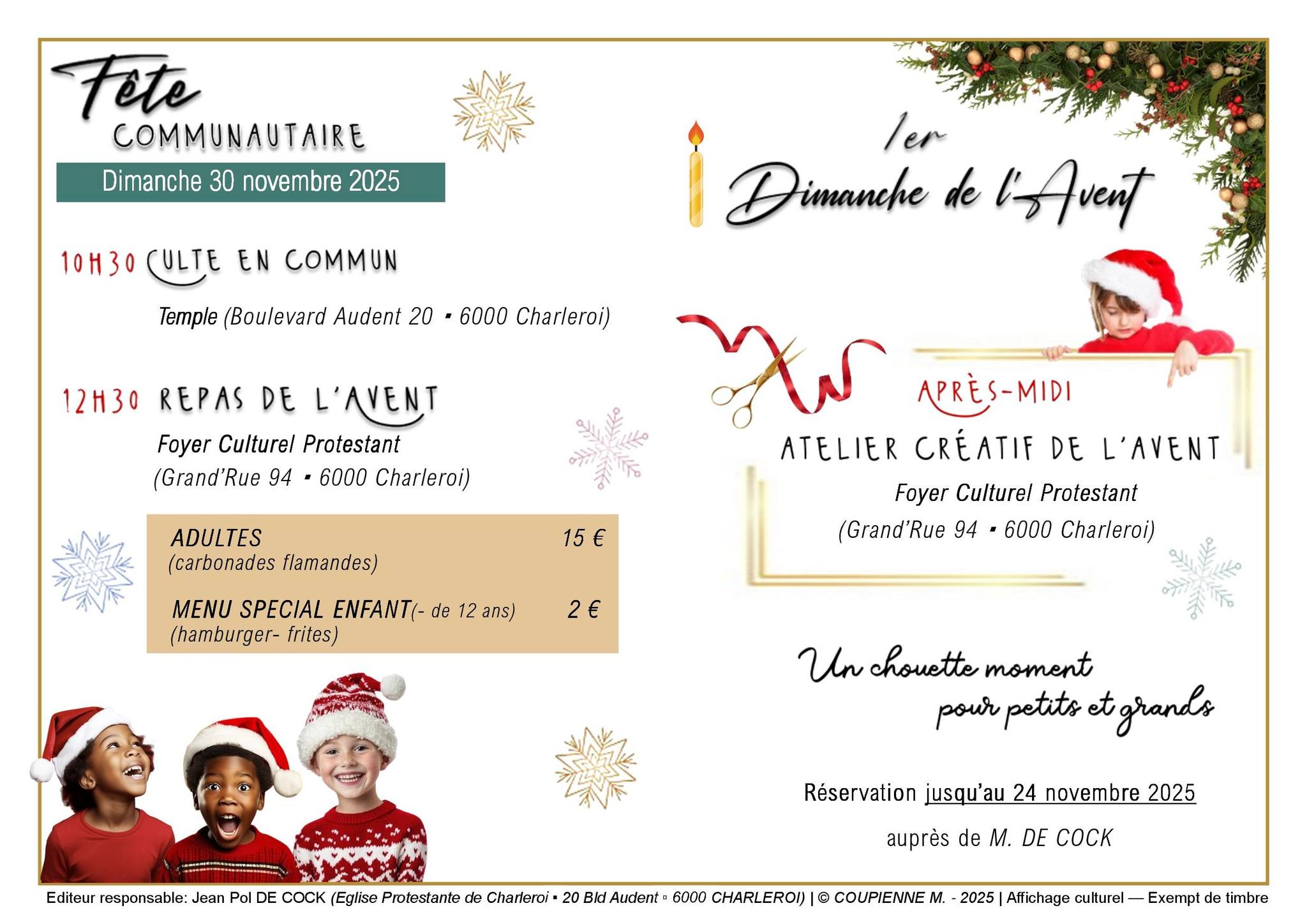 Accueil › Calendrier › Fête communautaire - Charleroi Fête communautaire – Charleroi 30/11/2025Grand'Rue 94, Charleroinone 12 Share on FacebookTweet on TwitterGoogle+LinkedInPinterest Descriptif L'itinéraire Share on FacebookTweet on TwitterGoogle+LinkedInPinterest Post navigation Previous EventRencontre festive de l’avent – QuaregnonNext EventUn Noël pour le Monde – Bruxelles Plus d'évènements 30Nov2025 Un Noël pour le Monde – Bruxelles 16:00 29Nov2025 Rencontre festive de l’avent – Quaregnon 11:00 – 17:00 09Nov2025 Soupe bienfaisante 16Nov2025 Étude biblique : prendre de l’âge 14:00 – 16:00 16Nov2025 Rencontre de l’amitié islamo-chrétienne – Protéger la nature 15:30 15Nov2025 Du passé, ne faisons table rase : à la rencontre de nos racines 15:00 – 18:00