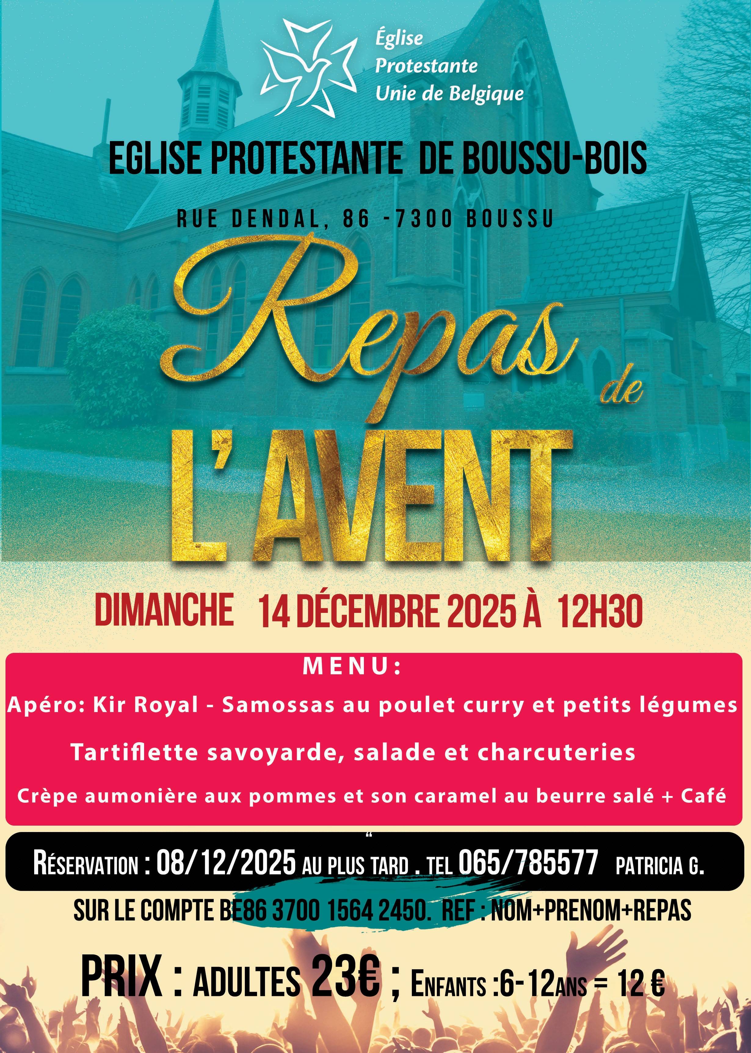 Accueil › Calendrier › Repas de l'avent - Boussu-Bois Repas de l’avent – Boussu-Bois 14/12/2025Rue Dendal 86, Boussu-Boisnone 23 Share on FacebookTweet on TwitterGoogle+LinkedInPinterest Descriptif L'itinéraire Share on FacebookTweet on TwitterGoogle+LinkedInPinterest Post navigation Previous EventConcert – The Bach Garden Plus d'évènements 12Déc2025 Concert – The Bach Garden 19:00 13Déc2025 Concert de Noël – Uccle 20:00 14Déc2025 Fête de Noël – Cuesmes 16:00 05Déc2025 La Campagne de l’Avent 2025 au Burundi 30Nov2025 Un Noël pour le Monde – Bruxelles 16:00 30Nov2025 Fête communautaire – Charleroi